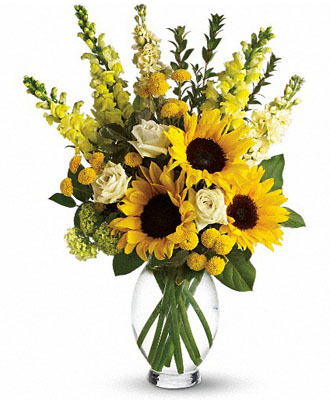 The Here Comes the Sun bouquet by Teleflora features a variety of seasonal flowers, including bright yellow sunflowers - a symbol of appreciation for those who have been there for us through thick and thin. Snapdragons and white stocks add a celebratory touch, while green button spray adds elegance and beauty.